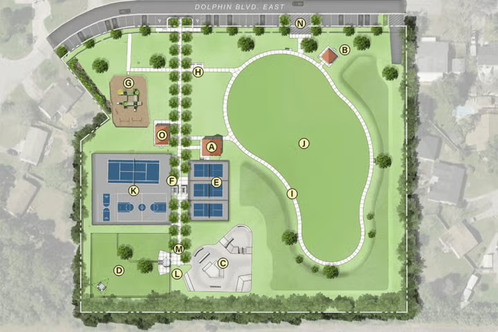 The DeLeon Shores Park conceptual plan features permanent bathrooms, shade trees, pickleball, new skateboard area, seating, walkway, bigger dog park and more!